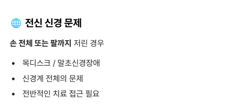특정 손가락만 저리면 국소 문제, 손 전체나 팔까지 이어지면 신경계 문제일 가능성이 높습니다.