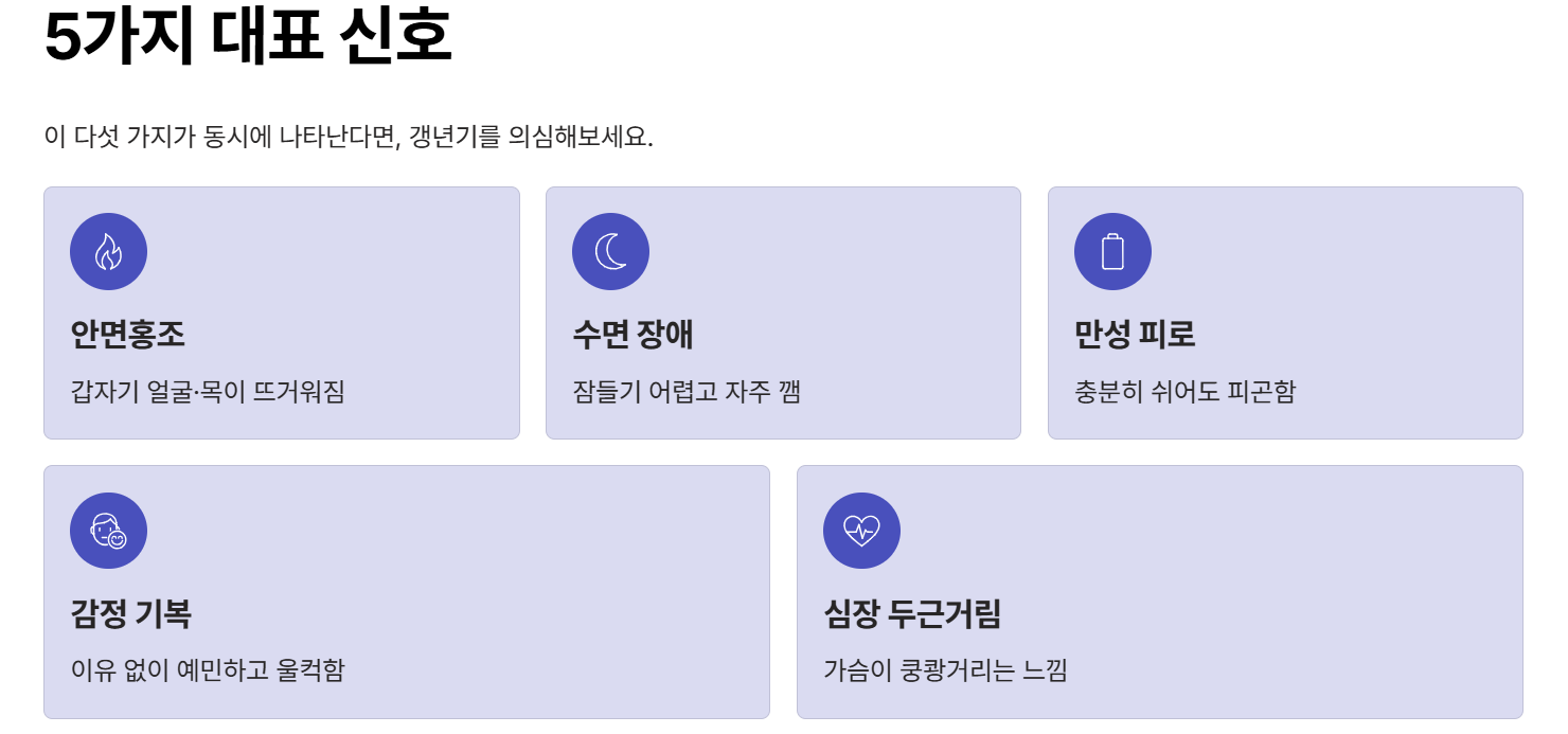갱년기증상은 개인차가 크지만, 대표적으로 안면홍조, 수면 장애, 피로감, 감정 기복, 심장 두근거림이 많이 나타납니다. 이 다섯 가지 신호가 동시에 나타난다면 갱년기를 의심해보고, 혼자 참지 말고 가족과 함께 이야기 나누며 관리해나가시길 바랍니다. 이 글이 조금이나마 도움이 되셨으면 좋겠습니다.