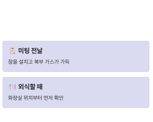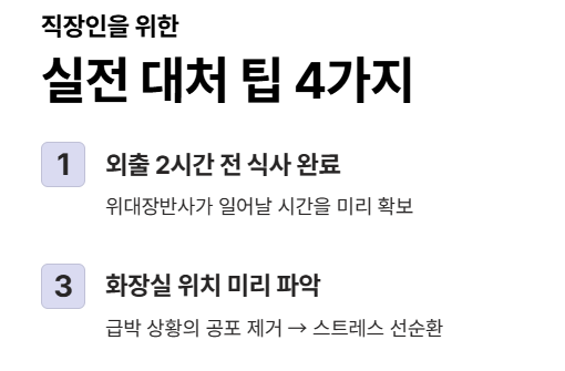 제가 직접 써본 실전 팁을 몇 가지 공유하면, 첫째는 외출 전 최소 2시간은 식사를 마치는 겁니다. 위대장반사가 일어날 시간을 충분히 확보하는 거죠. 둘째는 항상 지사제를 가방에 넣고 다니는 겁니다. 심리적 안정감만으로도 증상이 줄어드는 효과가 있습니다. 셋째는 화장실 위치를 미리 파악하는 겁니다. 이게 우습게 들릴 수 있지만, 급박한 상황에서 화장실을 못 찾는 공포가 스트레스를 더 키우거든요. 넷째는 탄산음료와 껌을 피하는 겁니다. 둘 다 장에 가스를 증가시킵니다.