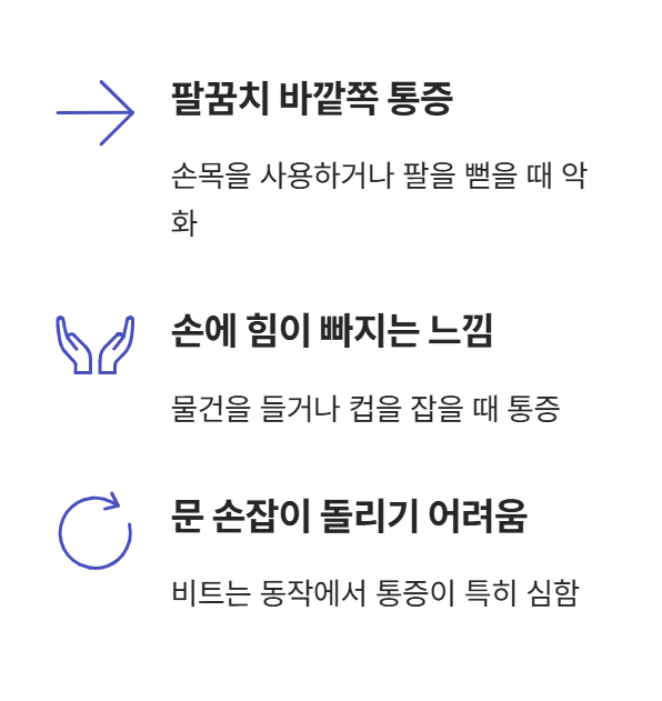 특히 컵을 들거나 문을 돌리는 동작에서 통증이 심해지는 것이 특징입니다.