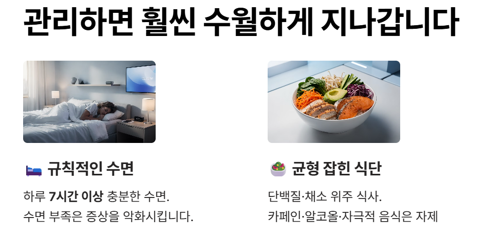 규칙적인 수면 시간을 유지하고, 식사를 거르지 않는 것만으로도 호르몬 균형에 도움이 됩니다. 특히 수면 부족은 증상을 악화시키는 주요 원인이에요. 보건복지부 자료에 따르면(출처: 보건복지부) 하루 7시간 이상의 충분한 수면이 갱년기 증상 완화에 효과적이라고 합니다.