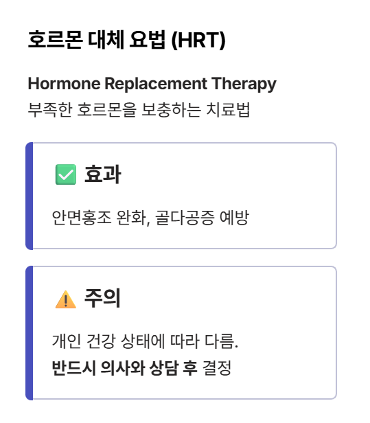 증상이 심할 경우에는 전문가의 도움을 받는 것도 고려해야 합니다. 호르몬 대체 요법(HRT, Hormone Replacement Therapy)이라는 치료가 있는데요. 이는 부족한 호르몬을 인위적으로 보충해주는 방법으로, 안면홍조나 골다공증 예방에 효과적입니다. 다만 개인의 건강 상태에 따라 적합성이 다르니 반드시 의사와 상담 후 결정해야 합니다.