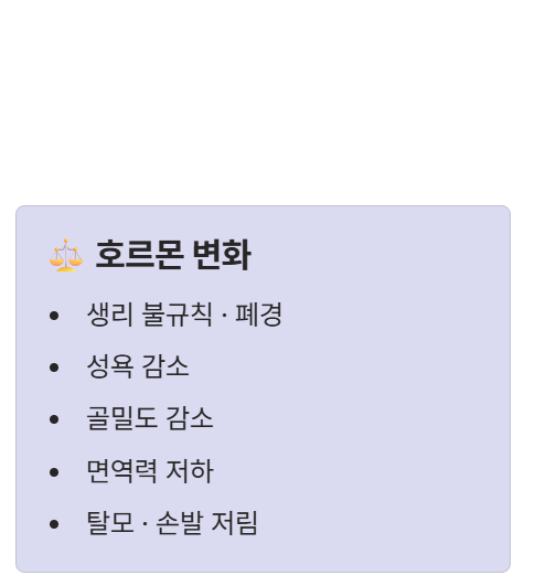 - 기타 신체 변화: 골밀도 감소, 면역력 저하