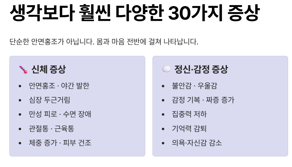 - 정신·감정 증상: 불안감, 우울감, 감정 기복, 짜증 증가, 집중력 저하, 기억력 감퇴, 의욕 저하, 자신감 감소