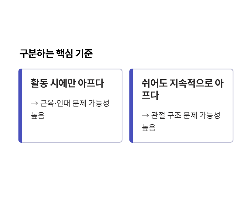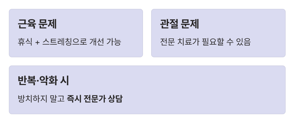 초기에는 단순 통증처럼 느껴지지만 반복될수록 관절 손상으로 이어질 수 있습니다.