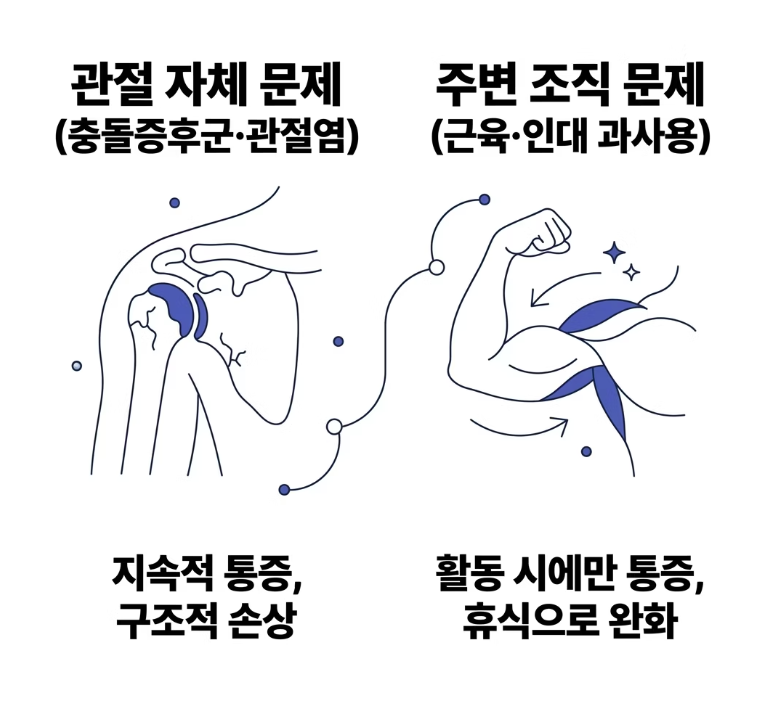 첫 번째는 관절 자체 문제입니다. 충돌증후군이나 관절염처럼 구조적 손상이 원인입니다.