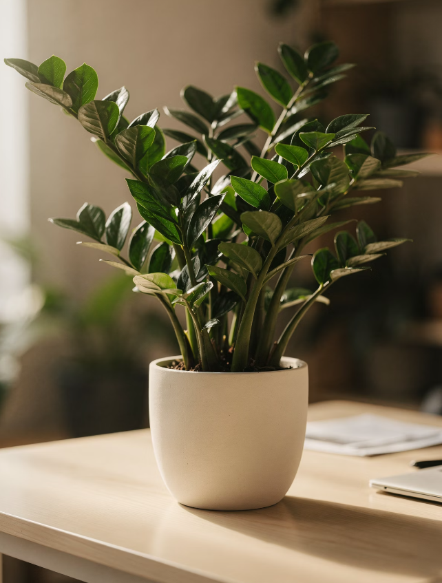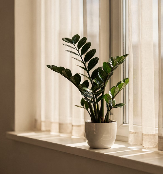 금전수는 밝은 간접광에서 가장 잘 자라는 식물입니다. 햇빛이 너무 부족하거나 반대로 강한 직사광선을 오래 받으면 잎 색이 변할 수 있습니다.