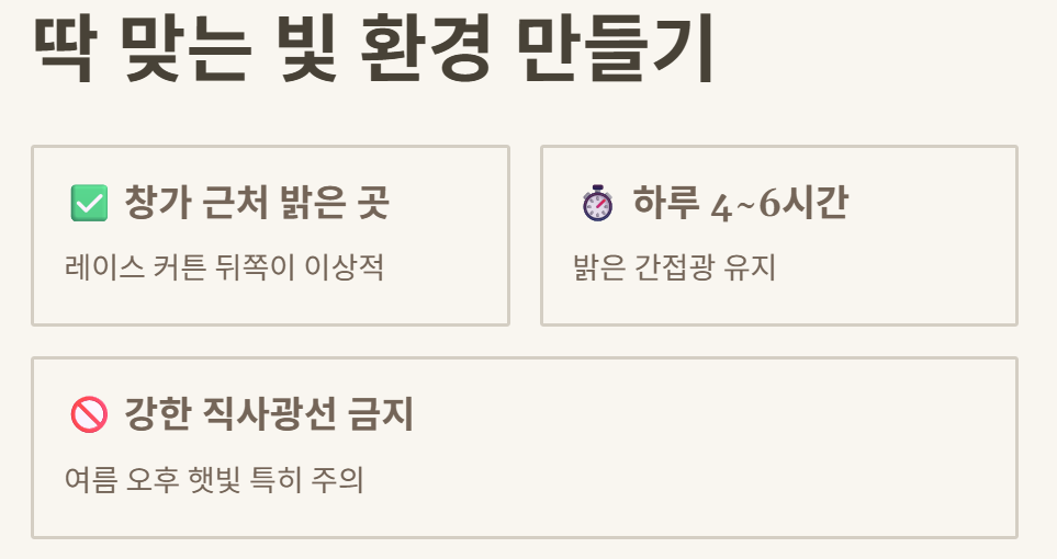 실내 식물은 빛 환경이 매우 중요하기 때문에 위치를 조정하는 것만으로도 상태가 개선되는 경우가 많습니다.