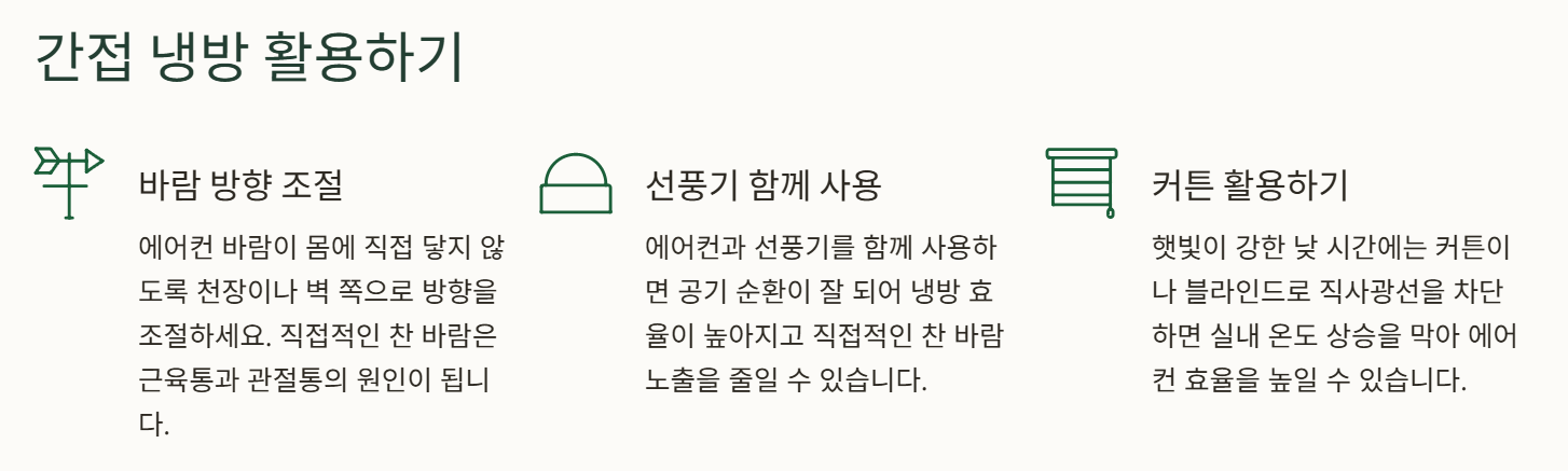 또한 직접적으로 에어컨 바람을 맞지 않도록 하는 것도 예방에 도움이 됩니다. 에어컨 바람이 몸에 바로 닿으면 근육과 관절이 차갑게 식어 혈액순환이 원활하지 못해 근육통이나 피로감을 느끼게 됩니다. 가능하다면 바람의 방향을 천장 쪽이나 벽 쪽으로 돌려 간접 냉방을 활용하는 것이 좋습니다.