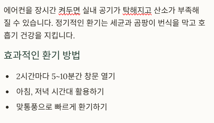 두 번째로는 환기 습관입니다. 에어컨을 장시간 켜 두면 실내 공기가 탁해지고 산소가 부족해질 수 있습니다. 따라서 2시간에 한 번은 창문을 열어 환기를 시켜주는 것이 좋습니다. 환기를 통해 세균과 곰팡이 번식을 막을 수 있고 신선한 공기로 호흡기 건강을 지킬 수 있습니다.