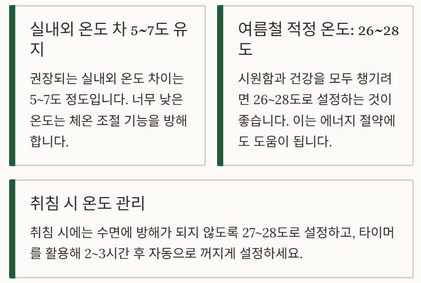 우선 가장 중요한 것은 실내외 온도 차이를 크게 두지 않는 것입니다. 권장되는 실내외 온도 차는 5~7도 정도이며, 무리하게 낮은 온도로 에어컨을 틀면 우리 몸의 체온 조절 기능이 무너져 쉽게 냉방병에 걸릴 수 있습니다. 시원함을 유지하면서도 건강을 지키려면 적정 온도를 설정하는 것이 필요합니다.