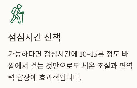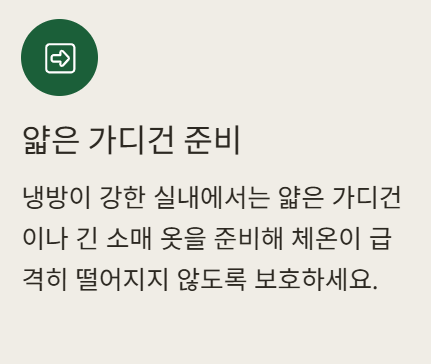 몸을 보호할 수 있는 작은 습관도 필요합니다. 냉방된 실내에서 장시간 머무를 경우 얇은 가디건이나 무릎담요를 준비해 체온이 급격히 떨어지지 않도록 하는 것이 좋습니다. 특히 여성이나 어린아이, 어르신처럼 체온 조절이 약한 사람에게는 필수적인 습관입니다.