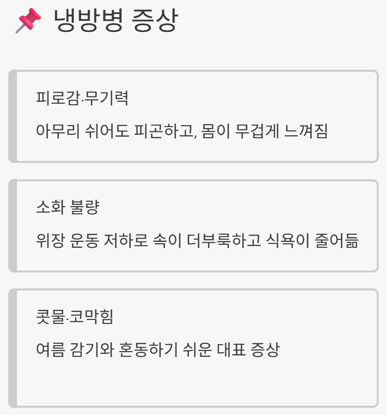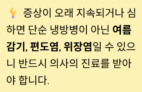 💡 증상이 오래 지속되거나 심하면 단순 냉방병이 아닌 여름 감기, 편도염, 위장염일 수 있으니 반드시 의사의 진료를 받아야 합니다.