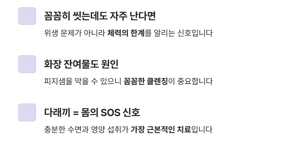 왜 하필 피곤할 때 생길까요? 우리 몸의 면역력 밸런스가 무너지면 평소 피부에 살던 세균이 침범하기 쉬운 상태가 되고, 피지샘의 배출 기능도 저하됩니다. 제 아내의 경우처럼 업무 스트레스가 극심하거나 생리 주기 전후로 호르몬 변화가 생길 때 다래끼가 빈번하게 나타나는 이유가 바로 여기에 있습니다. 결국 다래끼는 "지금 네 몸이 아주 피곤하니 좀 쉬어라"라고 몸이 보내는 신호인 셈입니다.