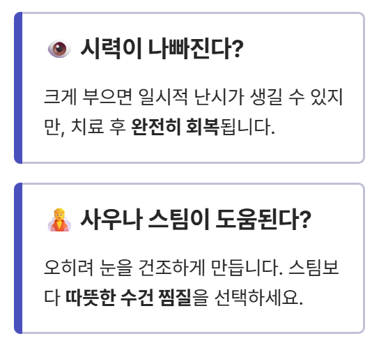 다래끼가 너무 크게 나면 눈동자를 눌러 일시적인 난시를 유발할 수 있습니다. 영구적인 시력 저하는 아니지만, 치료 후 다래끼가 사라지면 시력도 정상으로 돌아오니 걱정하지 않으셔도 됩니다. 마지막으로 사우나 스팀은 눈을 건조하게 해 오히려 독이 될 수 있으니, 스팀보다는 따뜻한 수건 찜질을 선호하시길 바랍니다.