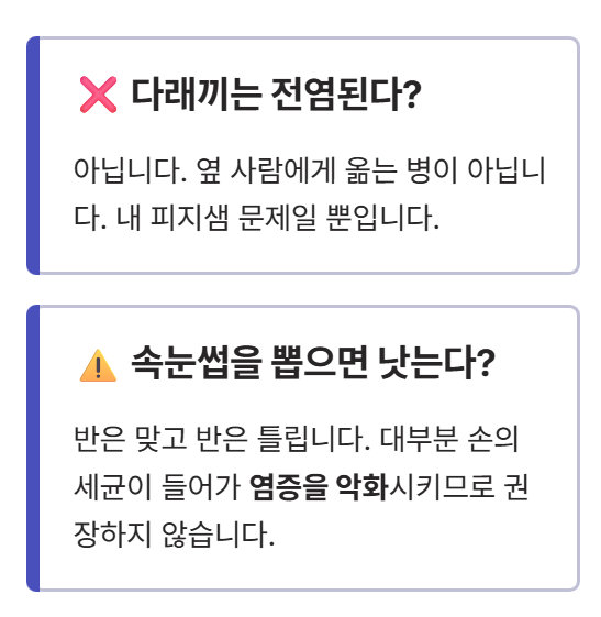 먼저, 다래끼는 옮지 않습니다. 옆 사람에게 전염되는 병이 아니라 내 눈의 피지샘 문제일 뿐입니다. 또한, 속눈썹을 뽑으면 낫는다는 말은 반은 맞고 반은 틀립니다. 아주 겉에 난 작은 다래끼는 눈썹을 뽑을 때 통로가 열려 피지가 배출될 수도 있지만, 대부분의 경우 손의 세균이 들어가 염증을 악화시키므로 권장하지 않습니다.