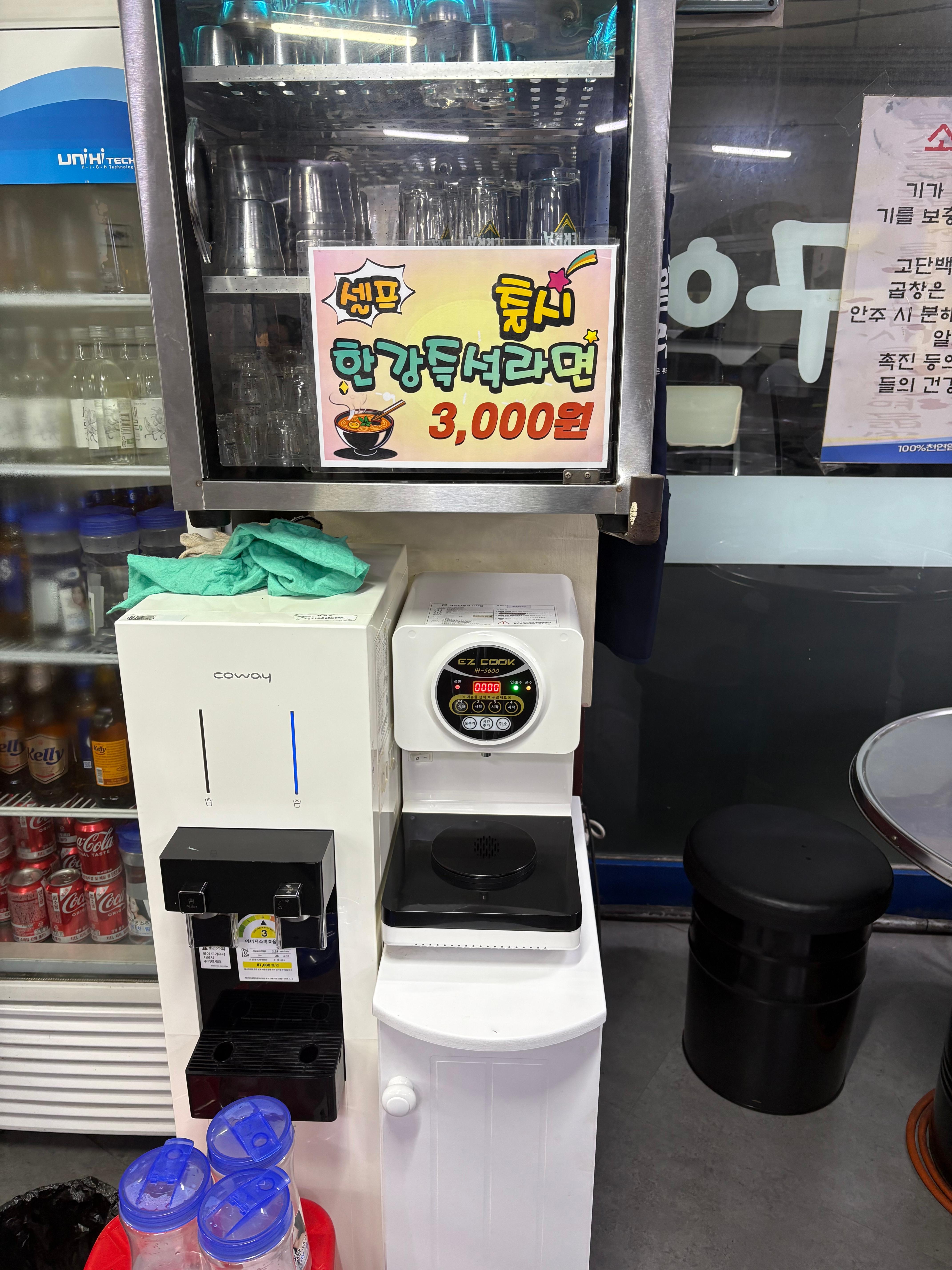 • 한강즉석라면(3,000원 추가, 셀프)너무 궁금해서 주문해본 한강즉석라면. 일회용 용기냄비에 라면 넣고 올려놓으면 알아서 물넣고 끓여줍니다.