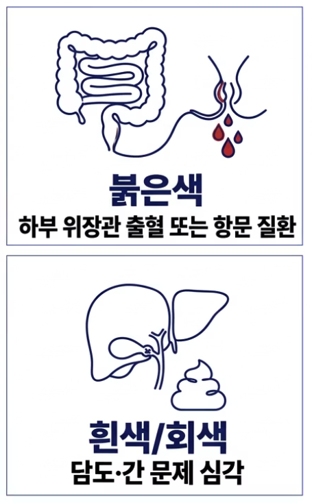- 흰색이나 회색 변은 담도·간 문제 가능성, 반드시 검사 필요