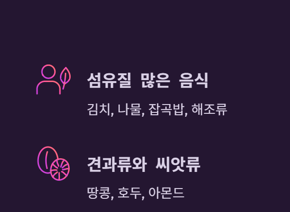 - 섬유질이 많은 음식 (김치, 나물, 잡곡밥, 해조류)