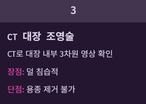 - 방법: CT 촬영을 통해 대장 내부를 3차원 영상으로 확인