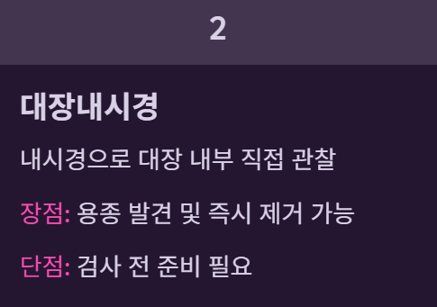 - 단점: 검사 전 장 세정제 복용과 음식 제한 필요, 검사 자체가 다소 부담스러울 수 있음