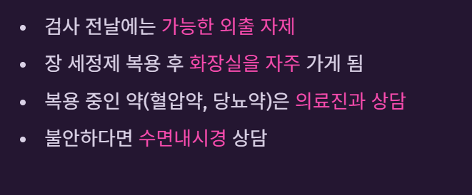 - 대신 전날 저녁부터 **장 세정제(약)**를 복용해 장을 깨끗하게 비워야 합니다.