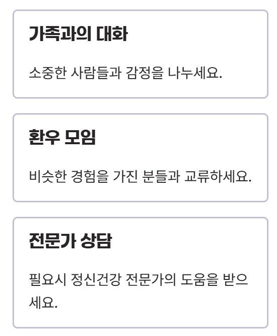 대장암 수술 후 환자들은 신체적 변화뿐만 아니라 정신적인 불안과 우울감을 겪기도 합니다. 가족, 친구와의 대화, 환우 모임, 전문가 상담 등을 통해 정서적 안정을 유지하는 것이 회복에 큰 힘이 됩니다.