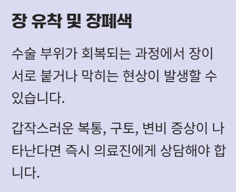 수술 부위가 회복되는 과정에서 장이 서로 붙거나 막히는 현상이 발생할 수 있습니다. 갑작스러운 복통, 구토, 변비 증상이 나타난다면 즉시 의료진에게 상담해야 합니다. - 배변 습관 변화