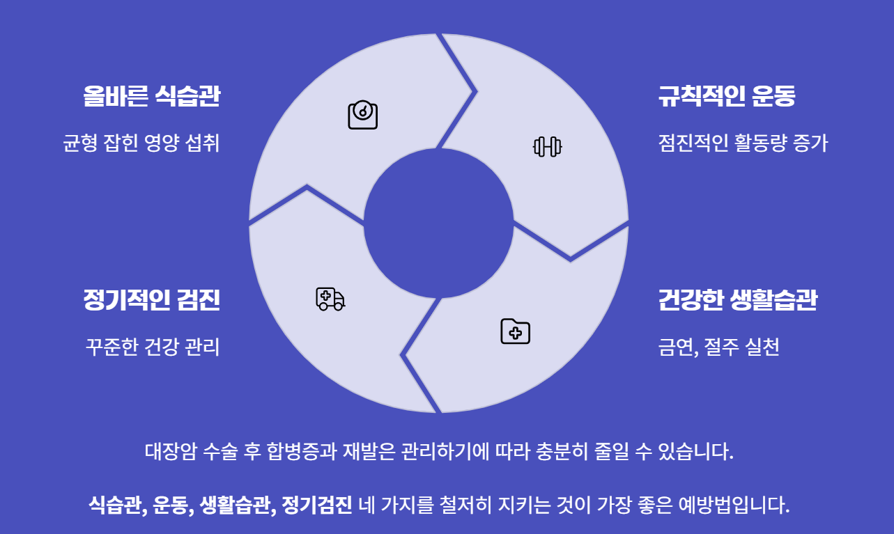대장암 수술은 끝이 아니라 새로운 출발점입니다. 수술이 잘 끝났다고 안심하기보다는 이후 관리가 더 중요합니다.