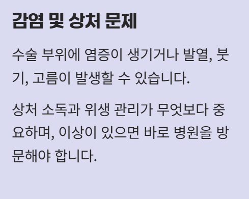 수술 부위에 염증이 생기거나 발열, 붓기, 고름이 발생할 수 있습니다. 상처 소독과 위생 관리가 무엇보다 중요하며, 이상이 있으면 바로 병원을 방문해야 합니다.