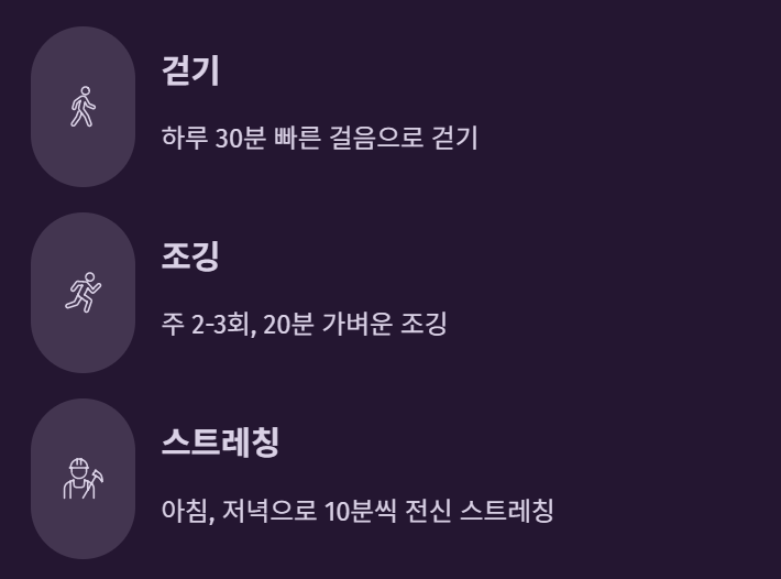 주 3~4회, 하루 30분 정도의 가벼운 유산소 운동은 혈액순환을 개선하고 면역세포 활동을 활성화합니다. 다만 과격한 운동은 오히려 피로를 쌓이게 하므로, 꾸준한 걷기·조깅·스트레칭이 가장 좋습니다.