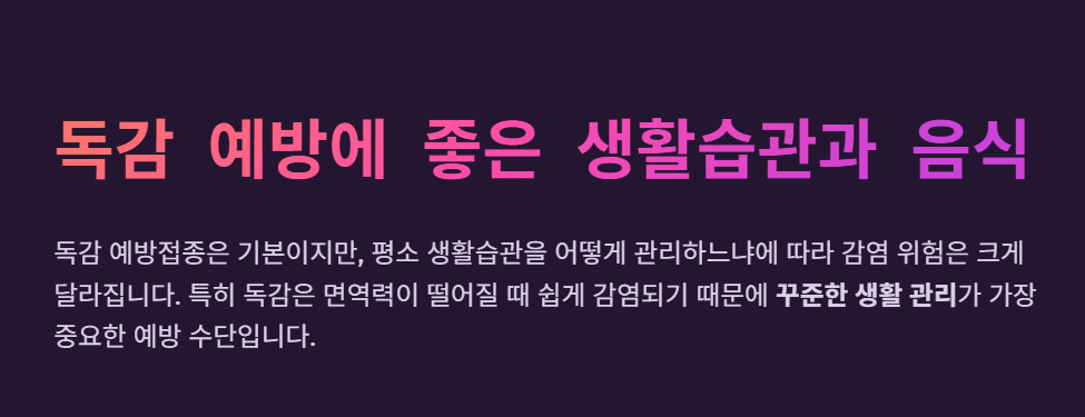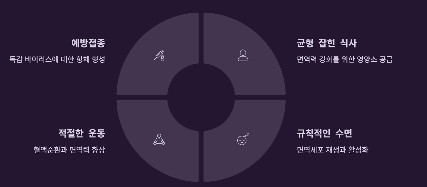 특히 독감은 면역력이 떨어질 때 쉽게 감염되기 때문에 꾸준한 생활 관리가 가장 중요한 예방 수단입니다.