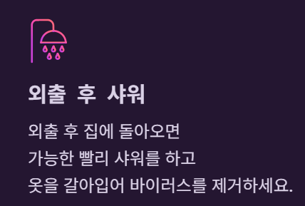 흐르는 물에 30초 이상 손을 씻는 습관, 외출 후 샤워하기, 마스크 착용은 기본적인 예방법입니다.