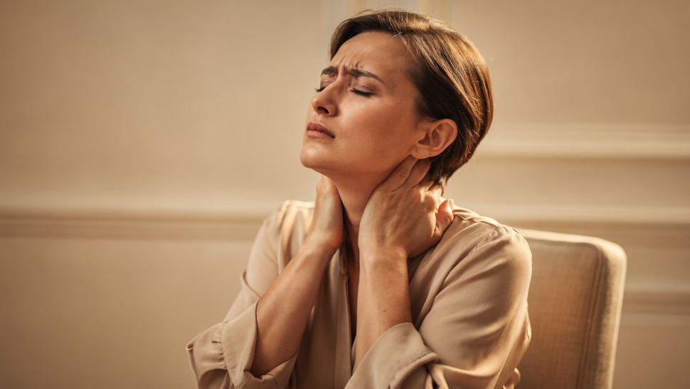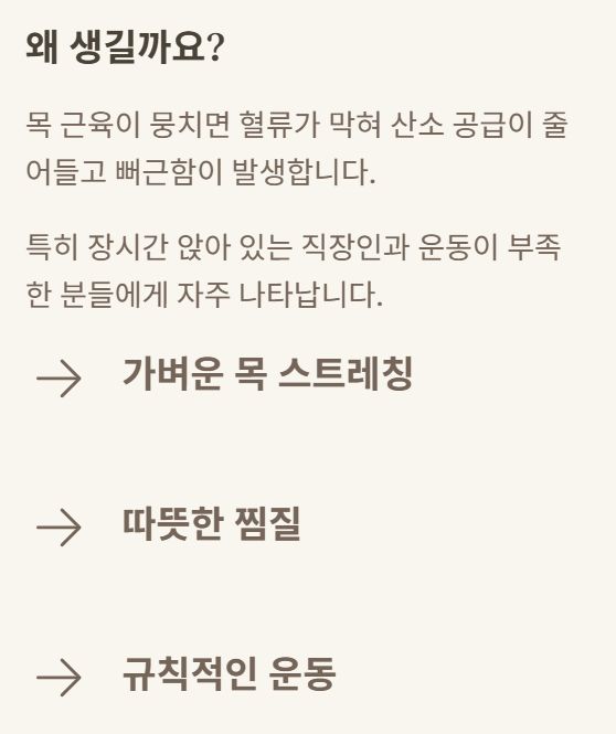목 주변 근육이 뭉치면 혈액순환이 원활하지 않아 뻐근함이 발생할 수 있습니다. 특히 오래 앉아 있는 직장인이나 운동량이 적은 사람에게서 자주 나타납니다.