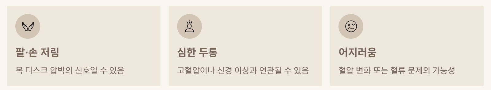 대부분의 뒷목 통증은 단순 근육 문제이지만, 특정 질환의 신호일 가능성도 있습니다. 예를 들어 목 디스크나 고혈압이 있는 경우에도 뒷목이 뻐근한 느낌이 나타날 수 있습니다.