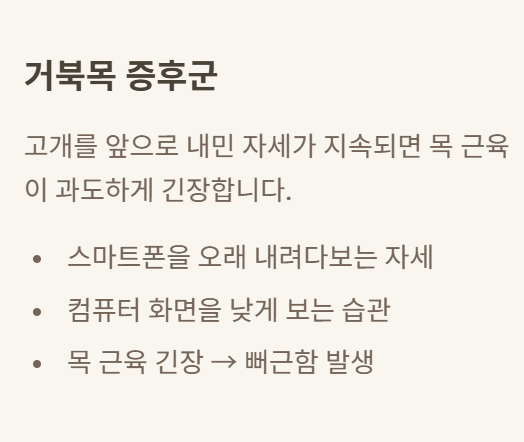 특히 고개를 앞으로 내민 상태가 오래 유지되면 목 근육이 긴장하면서 뻐근함이 나타납니다. 이를 흔히 ‘거북목 증후군’이라고 부르기도 합니다.