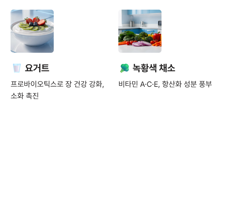 - 요거트: 유산균(프로바이오틱스)으로 장 건강 강화