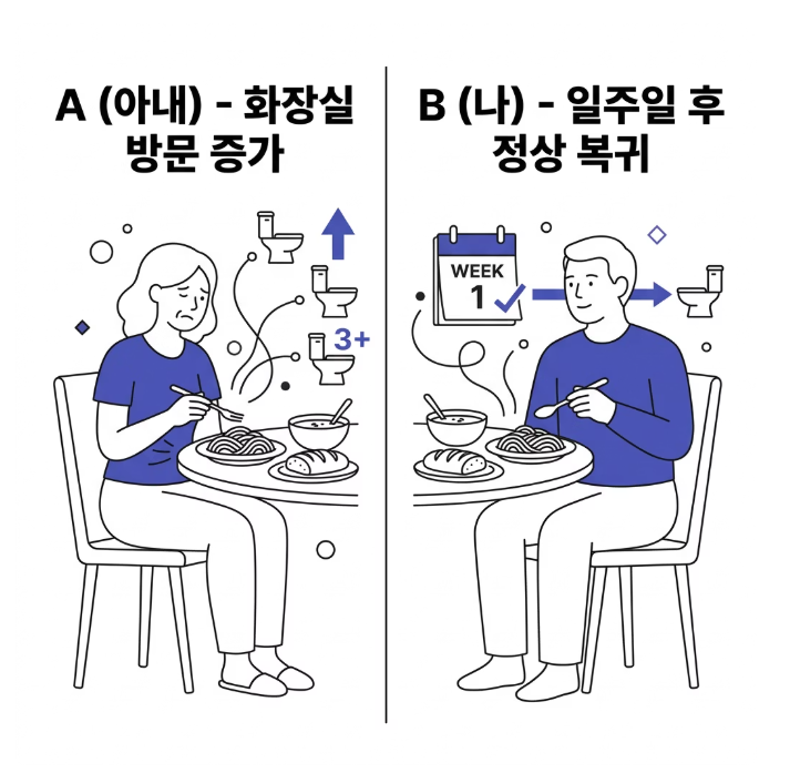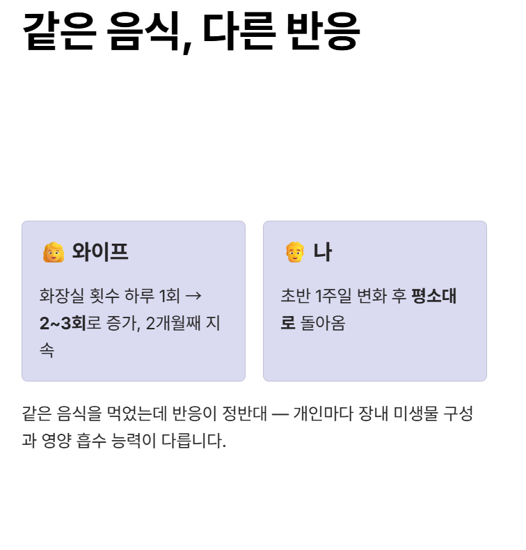 식단을 바꾸고 나서 예상 못 한 일이 생겼습니다. 와이프는 화장실을 하루에 2~3회 가게 됐고, 저는 오히려 횟수가 줄었습니다. 같은 음식을 먹었는데 반응이 정반대였던 거죠. 아직 정확한 이유는 모르겠지만, 개인마다 장내 미생물 구성이 다르고 영양소를 흡수하는 능력도 차이가 있어서 몸이 적응하는 시간이 필요한 것 같습니다.