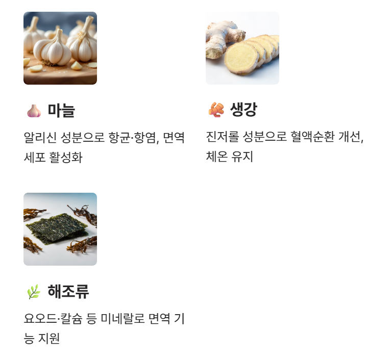 - 마늘: 알리신 성분으로 항균·항염 효과, 면역세포 활성화