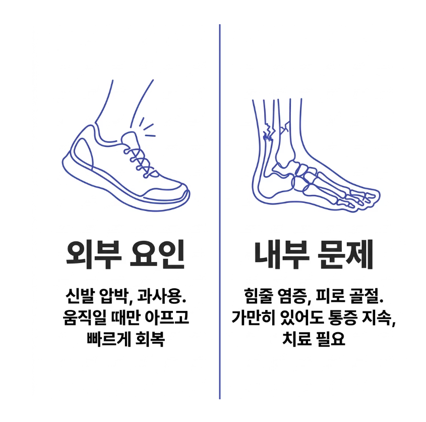 첫 번째는 외부요인입니다. 신발 압박이나 과사용으로 인해 발생하는 경우이며 비교적 빠르게 회복됩니다.