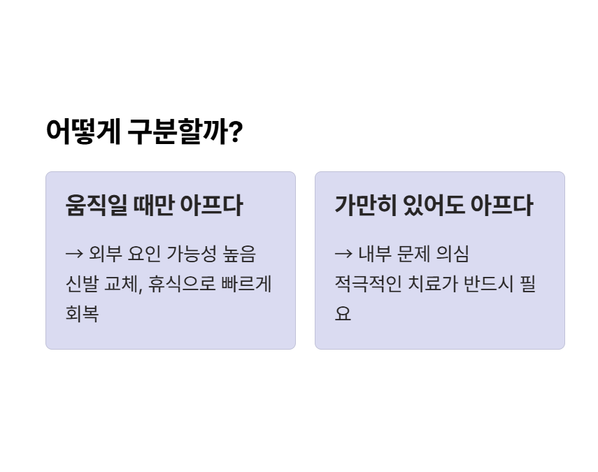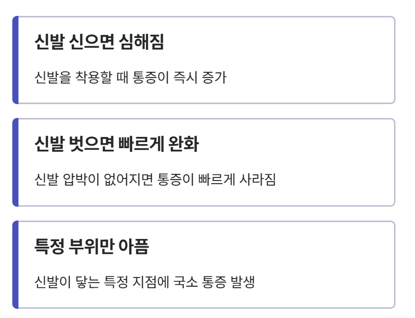 이 경우의 특징은 신발을 신었을 때 통증이 심해지고 신발을 벗으면 통증이 빠르게 줄어든다는 점입니다. 특정 부위만 아픈 경우도 많습니다.