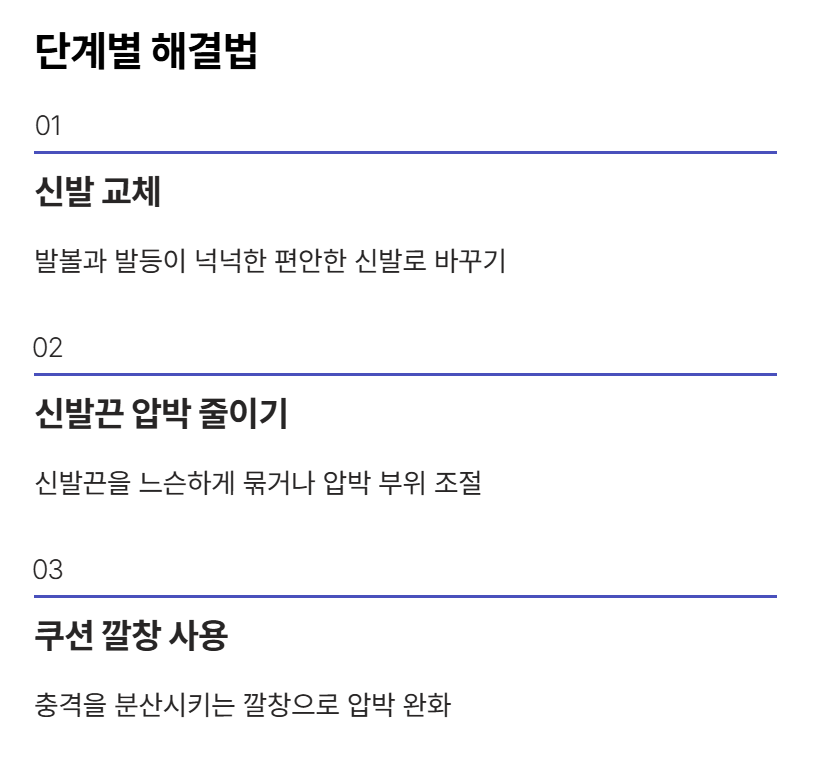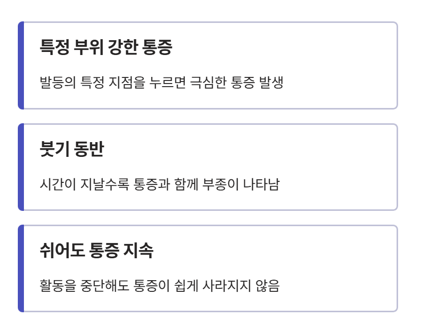 이 경우 발등을 누르면 통증이 느껴지고 발을 위로 들어올릴 때 불편함이 증가하는 특징이 있습니다. 초기에는 가벼운 통증으로 시작하지만 관리하지 않으면 점점 통증이 심해질 수 있습니다.