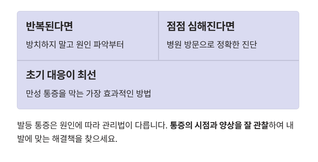발등통증은 단순 피로가 아니라 다양한 원인으로 발생할 수 있으며 원인에 따라 관리 방법도 달라집니다. 특히 통증이 언제 발생하는지 확인하는 것이 가장 중요합니다. 신발 문제나 일시적인 피로라면 빠르게 개선될 수 있지만 내부 손상이라면 반드시 치료가 필요합니다. 따라서 통증이 반복되거나 점점 심해진다면 방치하지 말고 적극적으로 관리해야 합니다. 작은 통증이라도 초기에 대응하는 것이 가장 효과적인 예방법입니다.