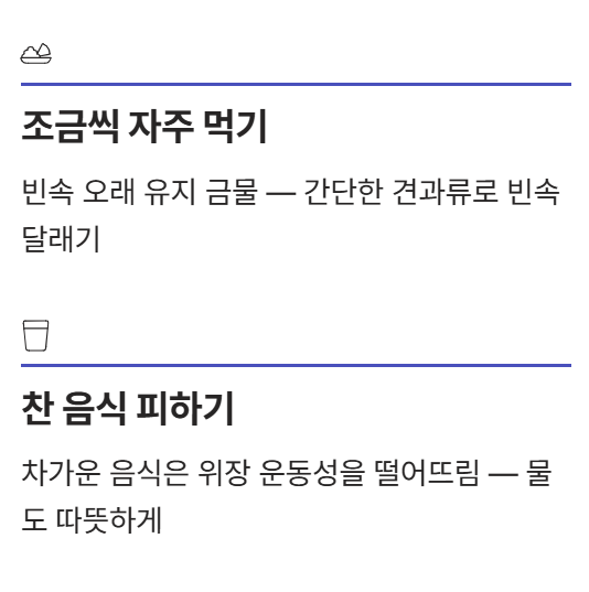 2. 조금씩 자주 먹기: 오랜 공복 후 한꺼번에 많이 먹으면 상복부에서 소리가 커지는 경향이 있습니다. 저도 아침을 거르는 습관이 있었는데, 간단한 견과류나 비스킷으로 빈속을 달래는 것만으로도 오전 소리가 줄었습니다.
