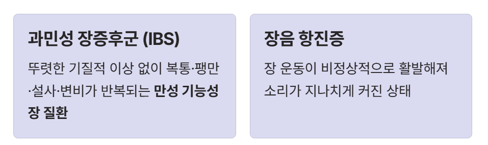저의 경우, 병원에서 진찰을 받으니 원래 과민성 장증후군(Irritable Bowel Syndrome, IBS)이 있었는데 스트레스와 피로가 겹치면서 증상이 더 민감하게 터진 것이라는 진단을 받았습니다. 과민성 장증후군이란 뚜렷한 기질적 이상 없이 복통, 복부 팽만, 설사나 변비가 반복되는 만성 기능성 장 질환입니다. 솔직히 이 진단을 받기 전까지는 그냥 예민한 배 정도로만 생각했는데, 제대로 된 이름이 붙어 있을 줄은 몰랐습니다.