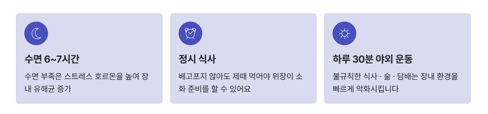 6~7시간 수면, 정해진 시간에 식사하기, 하루 30분 야외 운동 이 세 가지가 기본입니다. 배가 고프지 않아도 제때 먹어야 위장이 소화 준비를 미리 할 수 있어요. 배고플 때 먹고 안 고프면 안 먹는 습관이 위장에는 꽤 큰 스트레스입니다.
