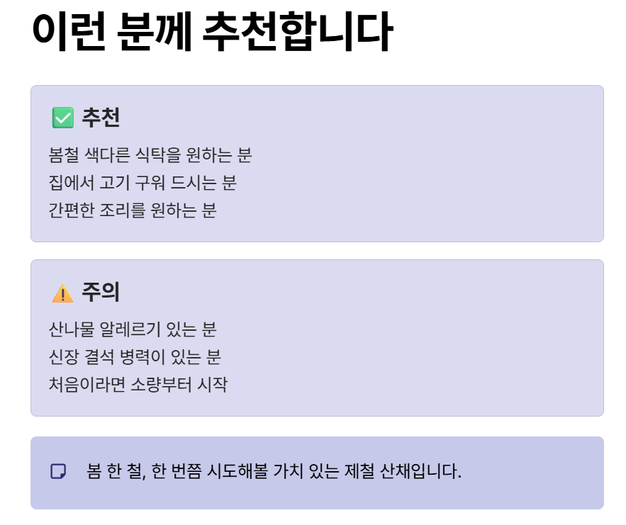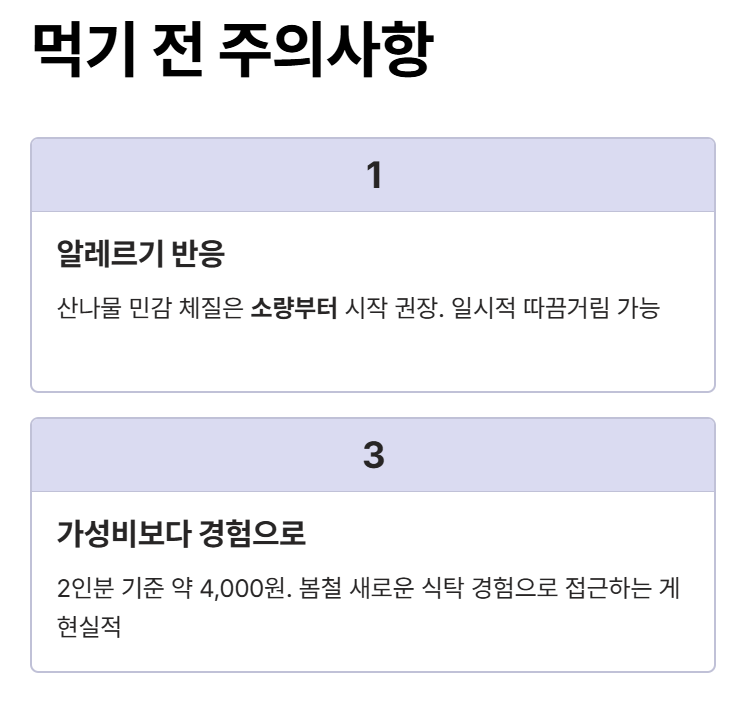 첫째는 알레르기 반응입니다. 산나물류에 민감한 체질이라면 소량부터 시작하는 게 좋습니다. 저는 괜찮았지만, 와이프가 처음 먹었을 때 입술이 약간 따끔거린다고 했습니다. 다행히 일시적인 반응이었고, 두 번째부터는 괜찮았습니다.