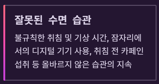 잘못된 수면습관의 지속, 심리적 요인 관리 미흡 등 여러가지 요인이 작용됩니다.
