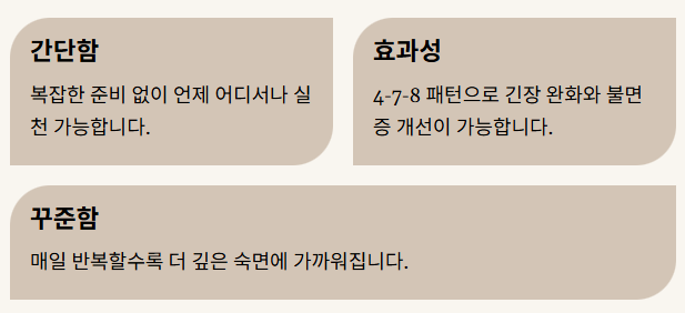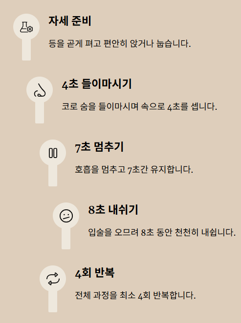 이 호흡법의 핵심은 숨을 들이마시는 시간(4초) - 숨을 멈추는 시간(7초) - 숨을 내쉬는 시간(8초)을 규칙적으로 반복하는 것입니다. 단순해 보이지만, 신체의 교감신경을 진정시키고 부교감신경을 활성화하는 데 큰 효과가 있다고 알려져 있습니다.