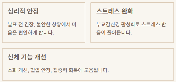 또한 교감신경을 과도하게 쓰는 현대인들에게 부교감신경을 활성화시켜 소화 개선, 혈압 안정, 집중력 회복에도 긍정적인 영향을 줍니다.